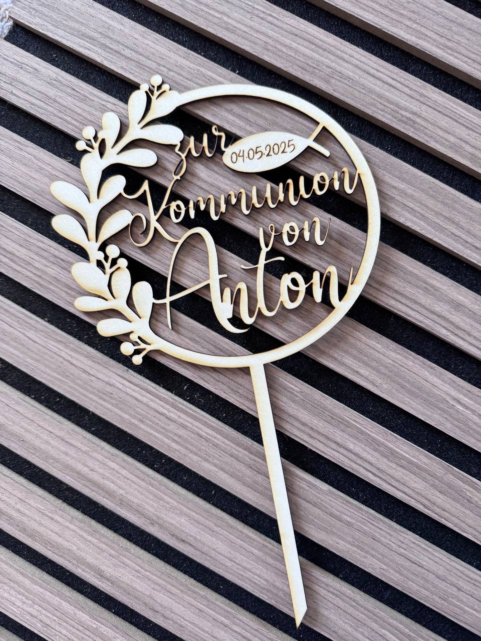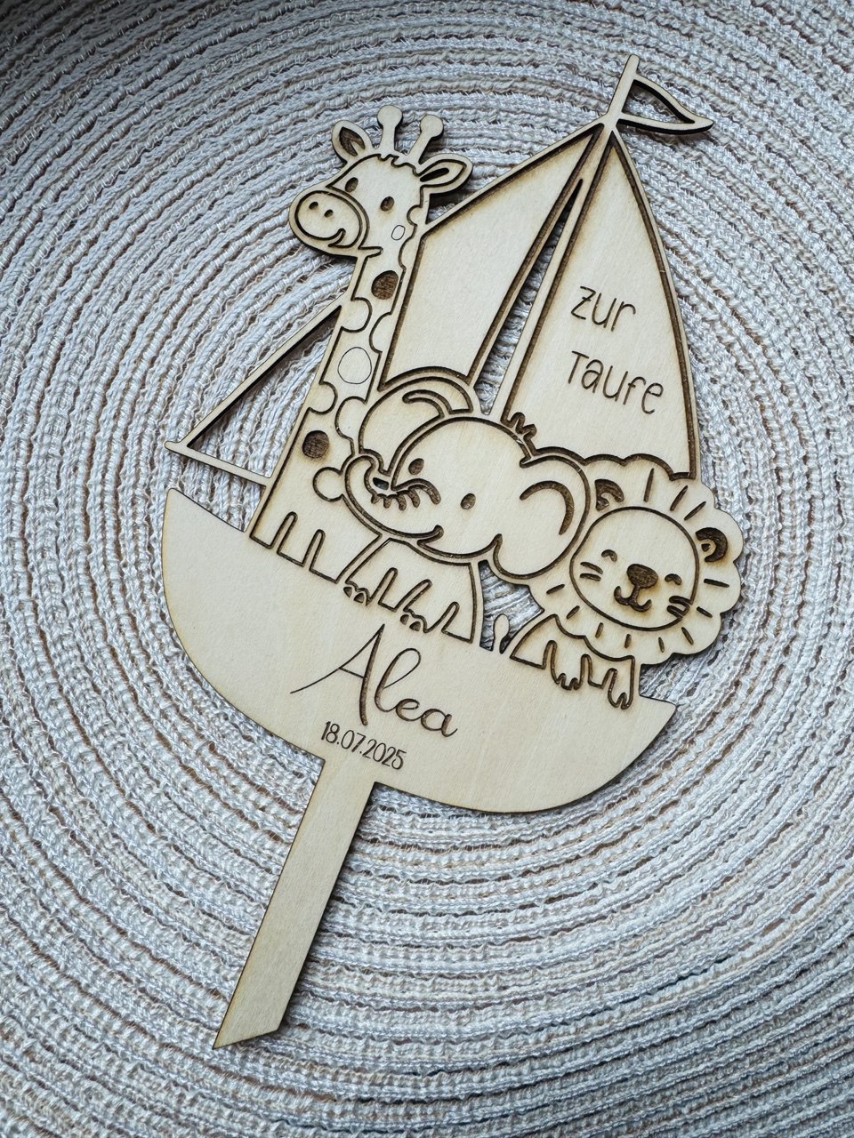 Bevor die Bestellung rausgeht, schicken wir dir eine Vorlage und du gibst uns dein Ok. Der Caketopper kann mit hellem Birkenholz oder aus dunklem Nussbaum in 3 mm dicke hergestellt werden.