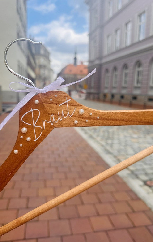 Unsere Kleiderbügel sind mit Perlen und einer Schleife verziert.