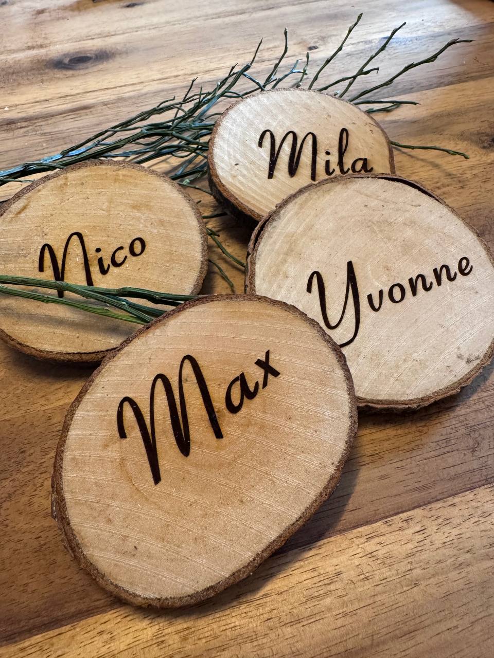 Suchst du individuelle Namensschilder für deine Veranstaltung? Wir gestalten sie auf natürlichen Holzscheiben mit einem Durchmesser von etwa 7 cm. Sende uns einfach die gewünschten Namen per WhatsApp oder E-Mail – wir kümmern uns um den Rest!