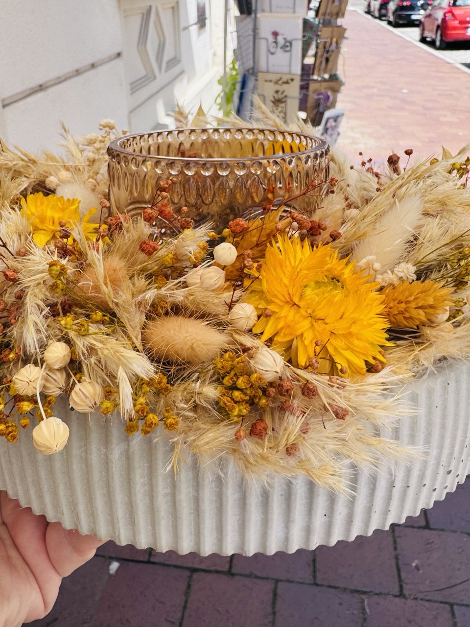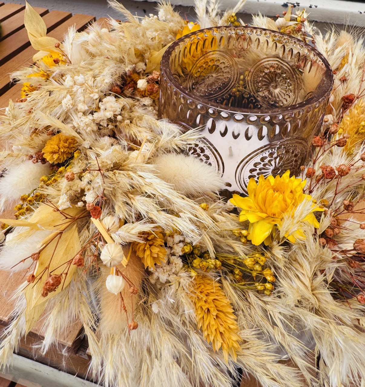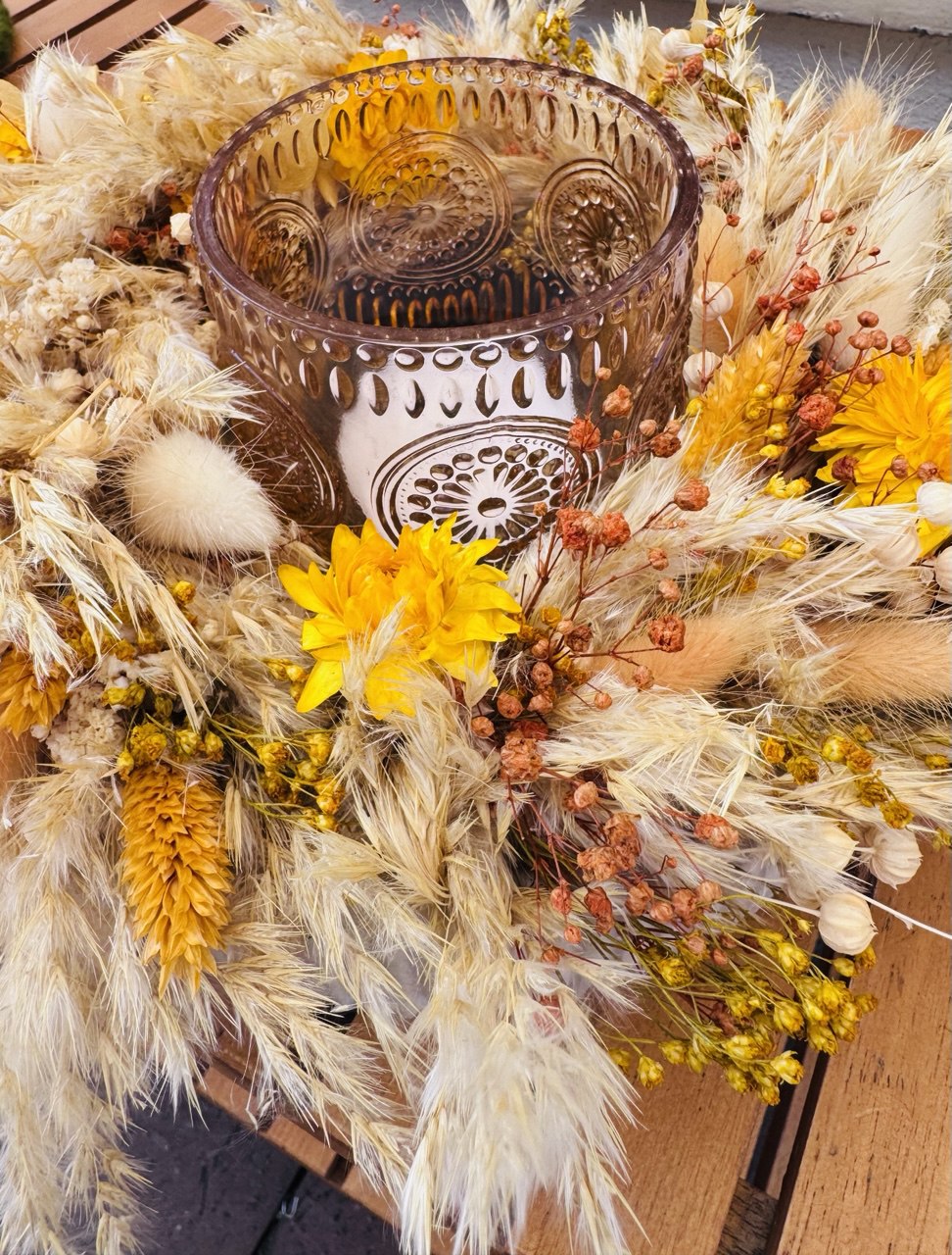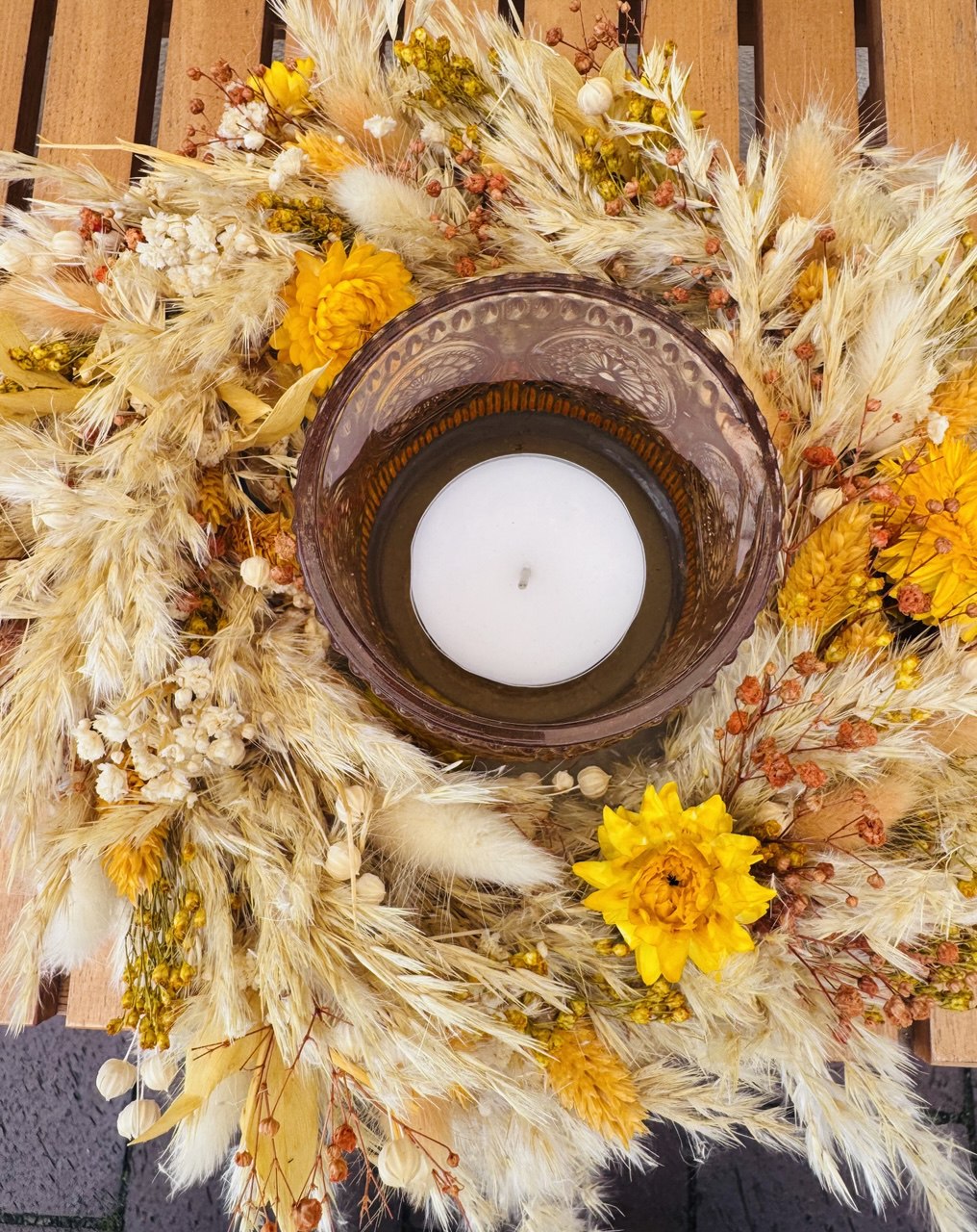 Dieser tolle Trockenblumenkranz ist auf einer selbstgegossenen Betonschale gelegt inkl einem Glas das als Windlicht dient :)