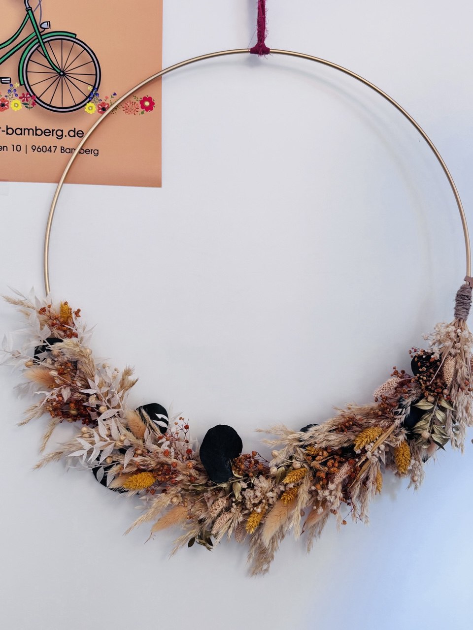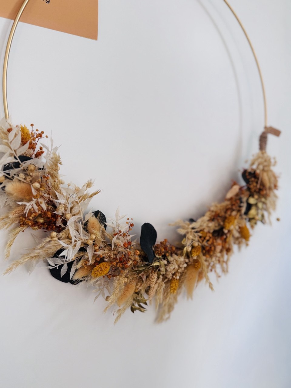 Der großzügige Trockenblumenkranz in Gold-, Grün- und Rottönen bringt stilvolles Flair und eine warme Atmosphäre in jedes Zuhause.